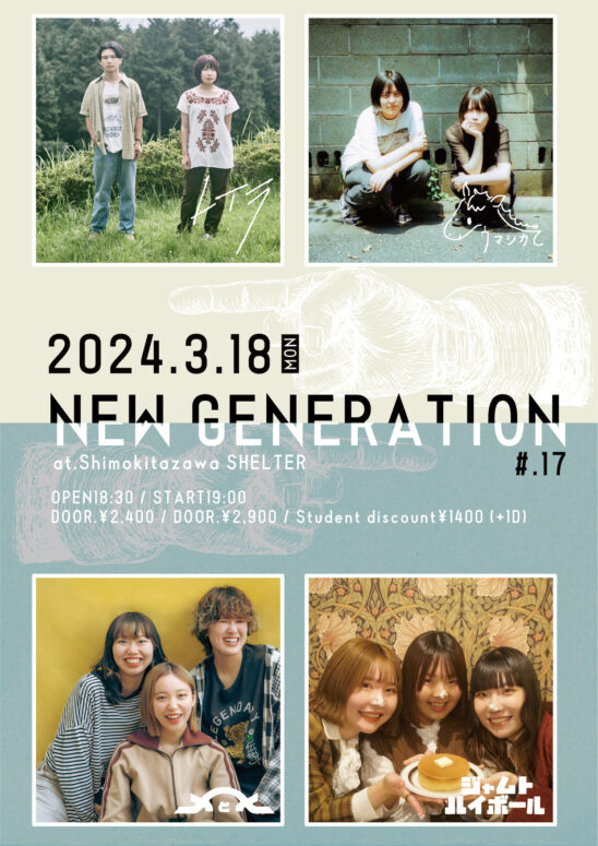 SCHEDULE 2024 03 18 Monday “ NEW GENERATION “ #.17 OPEN 18:30 - START 19:00 Tweet メとメ ウマシカて レイラ (O.A) ジャムトハイボール TICKETADV¥2,400 / DOOR¥2,900 / 高校生以下¥1,400 【発売日】 各BAND予約・SHELTER WEB予約 Share このイベントの予約は締めきりました。