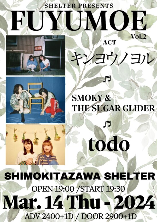 SCHEDULE 2024 03 14 Thursday SHELTER presents. FUYUMOE vol.2 OPEN 19:00 - START 19:30 Tweet SMOKY & THE SUGAR GLIDER todo キンヨウノヨル TICKETADV¥2400 / DOOR¥2900 【発売日】 2/1 21時〜Livepocket https://t.livepocket.jp/e/9z1cy SHELTER予約・各BAND予約 【入場順】 Livepocket→予約 Share このイベントの予約は締めきりました。