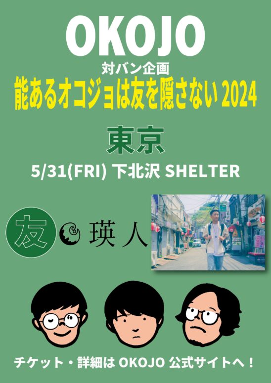 SCHEDULE 2024 05 31 Friday OKOJO 対バン企画 能あるオコジョは友を隠さない2024 OPEN 18:30 - START 19:00 Tweet OKOJO 瑛人 TICKETADV¥3500/ DOOR¥4000 【発売日】 ・ 最速先行 2月10日21:00~:チケットぴあ ・最速先行抽選2月16日21:00~:チケットぴあ 先行チケットは特典付き!! ・一般チケット4月9日21:00〜 イープラス https://eplus.jp/sf/detail/4081670001-P0030001 チケットぴあ https://w.pia.jp/t/okojo-24/ Share