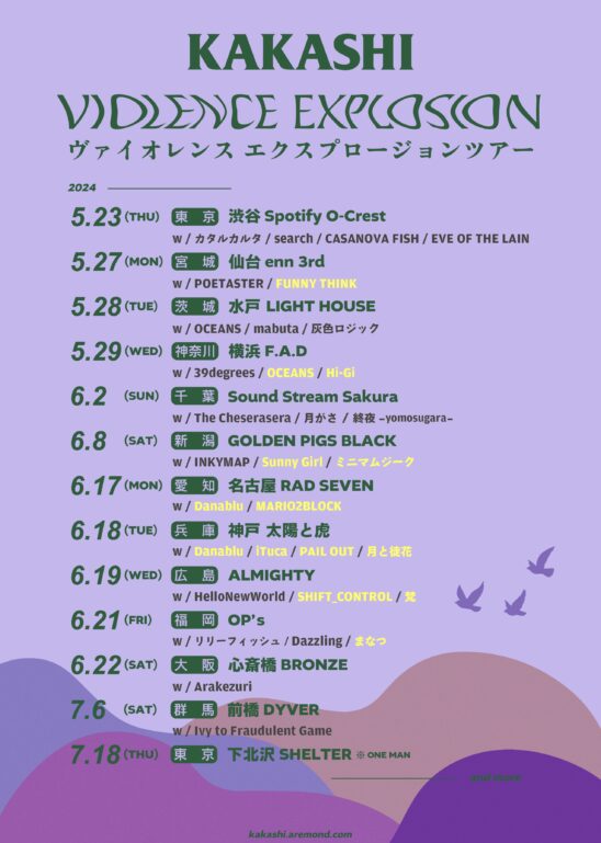 SCHEDULE 2024 07 18 Thursday KAKASHI「Draw the Rainbow」Release tour ヴァイオレンスエクスプロージョンツアーFINAL OPEN 18:30 - START 19:00 Tweet KAKASHI TICKETADV¥3500 / DOOR¥3800 【発売日】 3/16〜e+ https://eplus.jp/sf/detail/4061920001-P0030001 Share