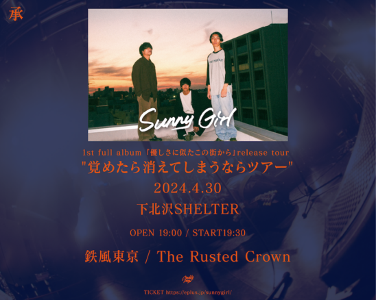 SCHEDULE 2024 04 30 Tuesday Sunny Girl 1stフルアルバム 優しさに似たこの街から Releasetour “覚めたら消えてしまうならツアー” OPEN 19:00 - START 19:30 Tweet Sunny Girl The Rusted Crown 鉄風東京 TICKETADV¥3000 【発売日】 2/14〜オフィシャル先行 3/4〜一般発売 e+ https://eplus.jp/sunnygirl/ Share
