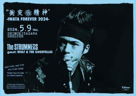 SCHEDULE 2024 05 09 Thursday “衝突的精神” -IWATA FOREVER 2024- OPEN 19:00 - START 19:30 Tweet The STRUMMERS GUEST:WOLF & THE GOODFELLAS ※録音、撮影禁止 TICKETADV¥3300 / DOOR¥3900 【発売日】 3/2〜e+・各BAND予約 Share