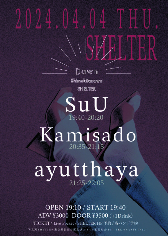 SCHEDULE 2024 04 04 Thursday SHELTER presents.Dawn OPEN 19:10 - START 19:40 Tweet ayutthaya SuU Kamisado TICKETADV¥3000 / DOOR¥3500 【発売日】 2024/2/29 21:00~ https://t.livepocket.jp/e/vkq8p 入場順 ①Livepocket ②SHELTER予約/バンド予約 整列順 Share このイベントの予約は締めきりました。
