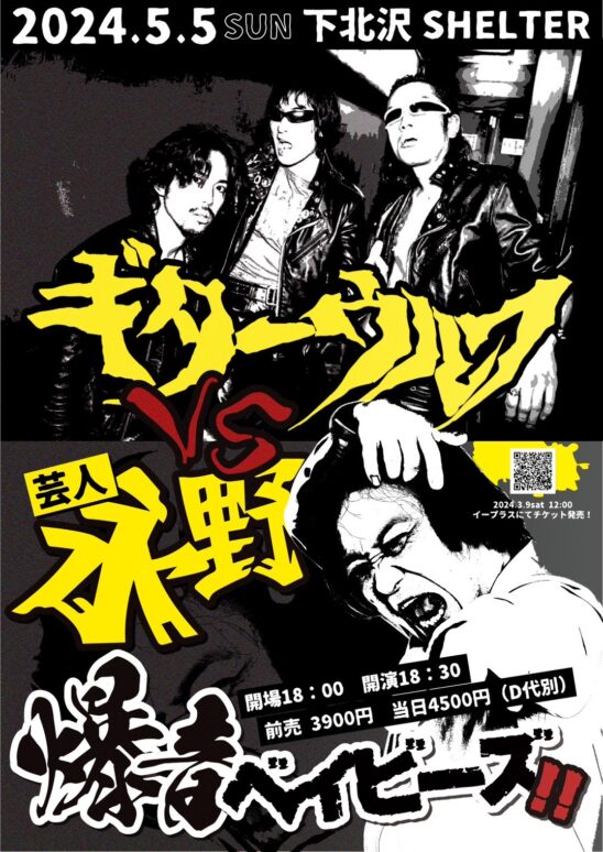 SCHEDULE 2024 05 05 Sunday 爆音ベイビーズ 「ギターウルフVS芸人永野」 OPEN 18:00 - START 18:30 Tweet ギターウルフ 永野 TICKETADV¥3900 / DOOR¥4500 【発売日】 THANK YOU!! SOLD OUT!! Share
