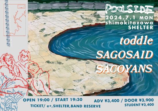 SCHEDULE 2024 07 01 Monday POOL SIDE OPEN 19:00 - START 19:30 Tweet toddle SAGOSAID SACOYANS TICKETADV¥3400 / DOOR¥3900 / 学生¥2400(※学生証提示) 【発売日】 5/11〜e+ https://eplus.jp/sf/detail/4092550001-P0030001 BAND・SHELTER予約 【入場順】 e+(整理番号順) → 予約(整列順)→当日券 Share このイベントの予約は締めきりました。
