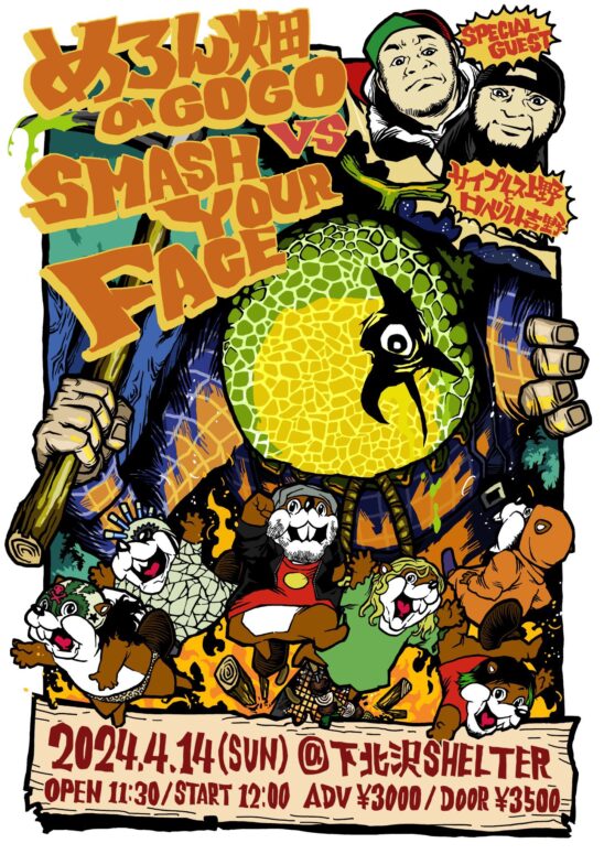 SCHEDULE 2024 04 14 Sunday DAY EVENT めろん畑a go go vs. SMASH YOUR FACE OPEN 11:30 - START 12:00 Tweet めろん畑a go go SMASH YOUR FACE SPECIAL GUEST:サイプレス上野とロベルト吉野 TICKETADV¥3000 / DOOR¥3500 【発売日】 SHELTER予約 Share このイベントの予約は締めきりました。