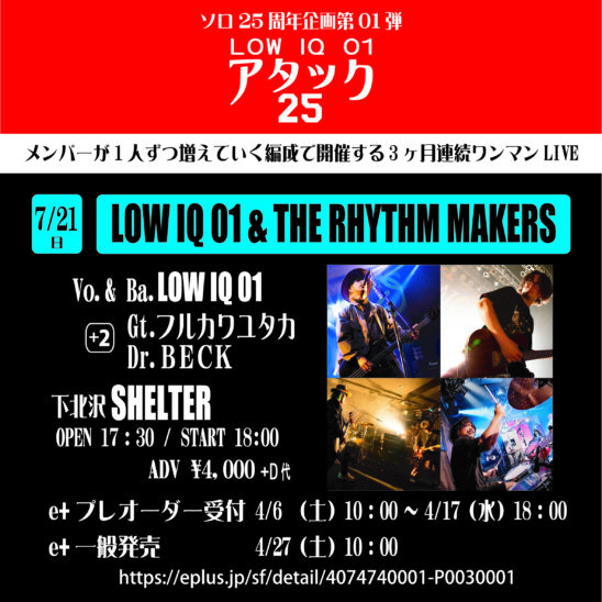 SCHEDULE 2024 07 21 Sunday LOW IQ 01 アタック25 OPEN 17:30 - START 18:00 Tweet LOW IQ 01 & THE RHYTHM MAKERS TICKETADV¥4000 / DOOR¥未定 【発売日】 THANK YOU!! SOLD OUT!! Share