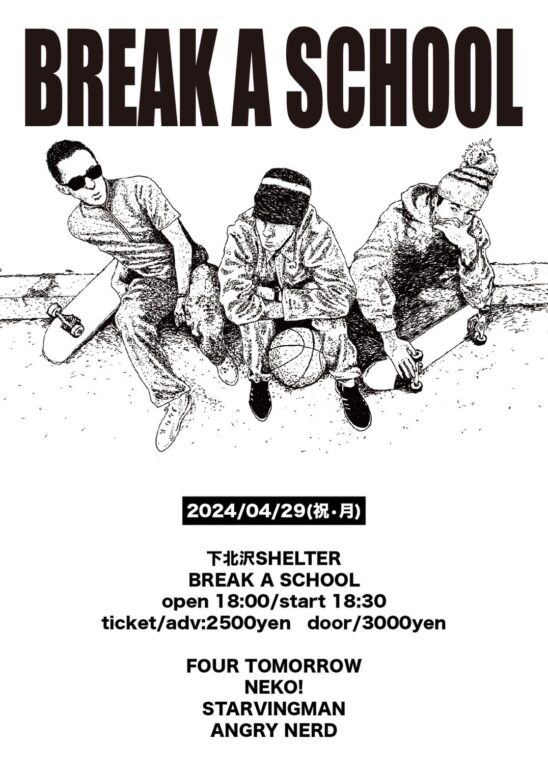 SCHEDULE 2024 04 29 Monday BREAK A SCHOOL OPEN 18:00 - START 18:30 Tweet Four Tomorrow neko! STARVINGMAN Angry Nerd TICKETADV¥2500 / DOOR¥3000 【発売日】 各BAND予約 Share