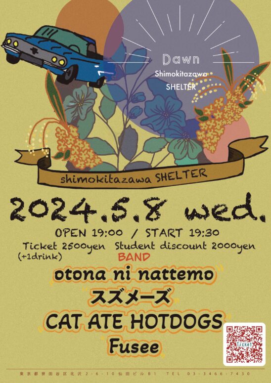 SCHEDULE 2024 05 08 Wednesday SHELTER pre. Dawn OPEN 19:00 - START 19:30 Tweet スズメーズ CAT ATE HOTDOGS Fusee otona ni nattemo TICKETADV¥2500 / DOOR¥3000 / 学割¥2000(学生証提示) <発売日> SHELTER予約 / バンド予約 Share このイベントの予約は締めきりました。