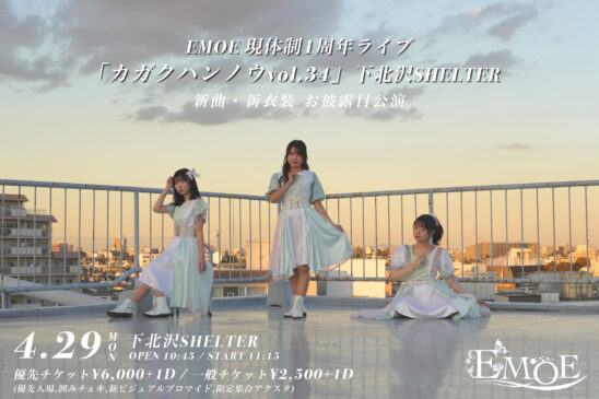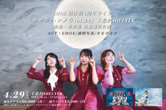 SCHEDULE 2024 04 29 Monday DAY EVENT 【カガクハンノウvol.34〜EMOE現体制1周年〜】 OPEN 10:45 - START 11:15 Tweet EMOE 透明写真 オモテカホ 他 TICKETADV¥2500 / 優先チケット¥6000 ※優先チケットには添付画像記載の特典がつきます 【発売日】 運営予約 Share