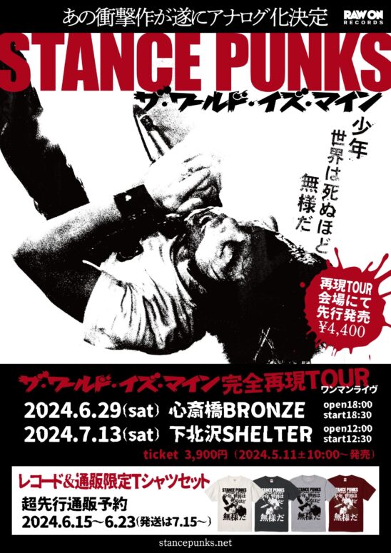 SCHEDULE 2024 07 13 Saturday DAY EVENT STANCE PUNKS 「ザ・ワールド・イズ・マイン」 レコード発売記念アルバム再現ライヴ OPEN 12:00 - START 12:30 Tweet STANCE PUNKS TICKETADV¥3900 / DOOR¥4500 【発売日】 5/11〜e+ Share