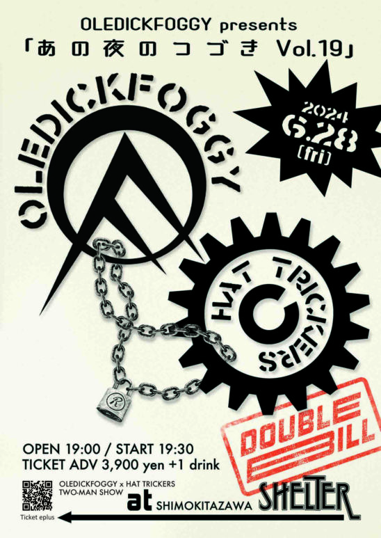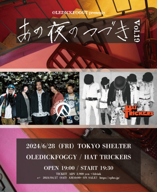 SCHEDULE 2024 06 28 Friday OLEDICKFOGGY presents「あの夜のつづき Vol.19」 OPEN 19:00 - START 19:30 Tweet OLEDICKFOGGY HAT TRICKERS TICKETADV¥3900 / DOOR¥未定 【発売日】 4/27〜e+・BAND予約 Share