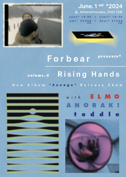 SCHEDULE 2024 06 01 Saturday Forbear pre.”Rising Hands vol.6″ -New Album”8songs”Release Show- OPEN 18:00 - START 18:30 Tweet Forbear toddle ANORAK! ELMO TICKETADV¥2900 / DOOR¥3400 【発売日】 Livepocket https://t.livepocket.jp/e/pcrio BAND予約 Share
