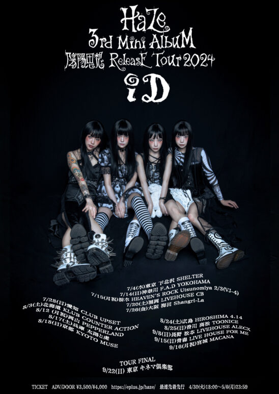SCHEDULE 2024 07 04 Thursday Haze 3rd mini album “陰陽思想” release tour「ID」 OPEN 19:00 - START 19:30 Tweet Haze TICKETADV¥3500 / DOOR¥4000 THANK YOU!! SOLD OUT!! ※6歳以上チケット必要 ※未就学児は保護者同伴の上入場可能 主催:ekoms 制作:シブヤテレビジョン Share