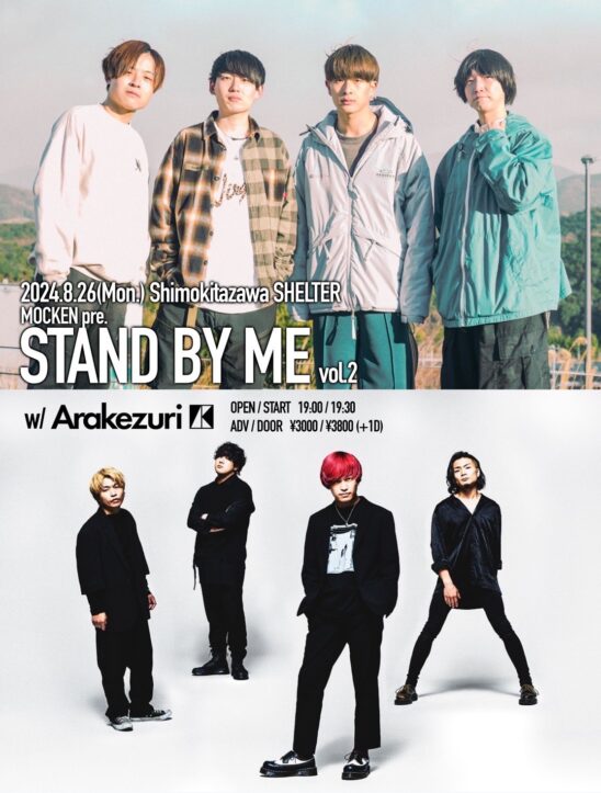 SCHEDULE 2024 08 26 Monday MOCKEN pre. STAND BY ME vol.2 OPEN 19:00 - START 19:30 Tweet MOCKEN Arakezuri TICKETADV¥3000 / DOOR¥3800 【発売日】 5/30〜e+ https://eplus.jp/sf/detail/4105600001-P0030001 Share