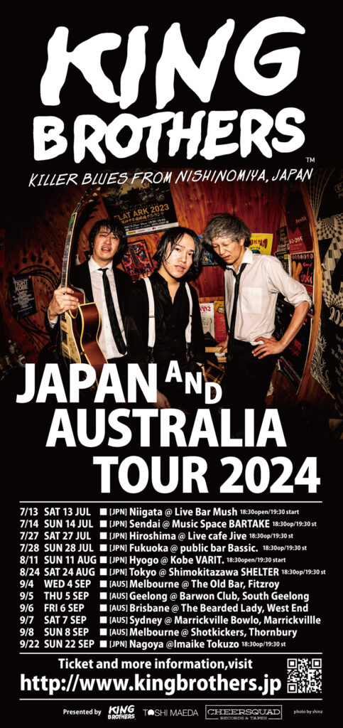 SCHEDULE 2024 08 24 Saturday KING BROS Presents 『KING BROTHERS JAPAN & AUSTRALIA TOUR 2024』 OPEN 18:30 - START 19:30 Tweet キングブラザーズ[from 西宮] O.A :AKOGARE TICKET最速先行チケット¥3800 / ADV¥4300 / DOOR¥未定 *全ての学生は当日学生証の提示で1000円のキャッシュバック! 【KING BROS WEB 最速先行チケット】 5/19〜正午 https://peatix.com/event/3950293/ 【入場順】 最速先行→予約→当日券 Share