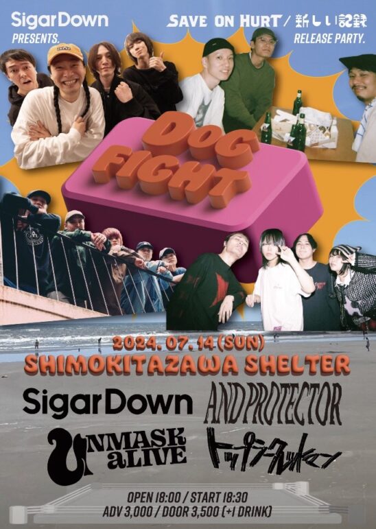 SCHEDULE 2024 07 14 Sunday SigarDown pre. ” DOG FIGHT ” – SAVE ON HURT/新しい記録 RELEASE PARTY – OPEN 18:00 - START 18:30 Tweet SigarDown And Protector UNMASK aLIVE トップシークレットマン TICKETADV¥3000 【発売日】 5/22〜Livepocket・各BAND予約 https://t.livepocket.jp/e/xwqew ※Livepocketが先のご入場となります。 Share