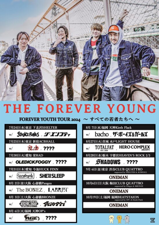 SCHEDULE 2024 07 24 Wednesday THE FOREVER YOUNG pre. FOREVER YOUTH TOUR 2024 すべての若者たちへ OPEN 18:00 - START 18:30 Tweet THE FOREVER YOUNG STANCE PUNKS ジ・エンプティ TICKETADV¥3500 / DOOR¥4000 【先行チケット】 6/1〜e+ https://eplus.jp/tfy-2024/ Share