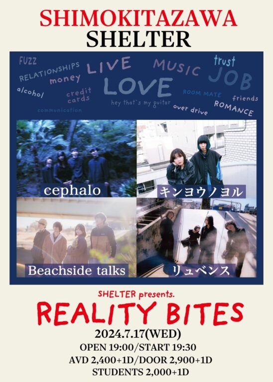 SCHEDULE 2024 07 17 Wednesday SHELTER presents. REALITY BITES OPEN 19:00 - START 19:30 Tweet キンヨウノヨル リュベンス Beachside talks cephalo TICKETADV¥2400 / DOOR¥2900 / 学割¥2000 【発売日】 SHELTER予約・各バンド予約 Share このイベントの予約は締めきりました。