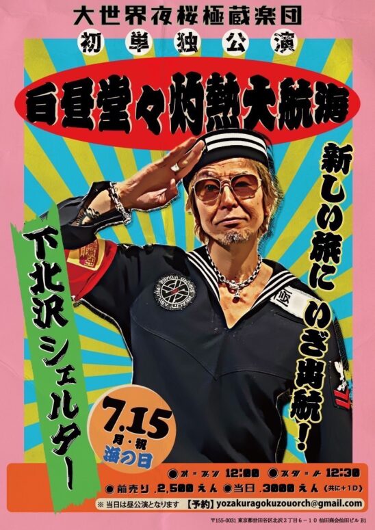 SCHEDULE 2024 07 15 Monday DAY EVENT 『白昼堂々灼熱大航海』 OPEN 12:00 - START 12:30 Tweet 大世界夜桜極蔵楽団 TICKETADV¥2500 / DOOR¥3000 【発売日】 BAND予約 Share