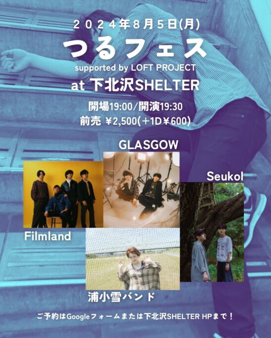 SCHEDULE 2024 08 05 Monday つるフェス supported by LOFT PROJECT OPEN 19:00 - START 19:30 Tweet GLASGOW 浦小雪バンド Seukol Filmland TICKETADV¥2500 / DOOR¥3000 【発売日】 主催予約 https://forms.gle/SenwvonSgegCeng97 SHELTER予約 Share このイベントの予約は締めきりました。