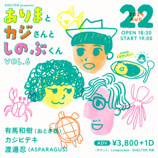 SCHEDULE 2024 08 22 Thursday SHELTER presents. 『ありまとカジさんとしのぶくん』VOL.6 OPEN 18:30 - START 19:00 Tweet 有馬和樹(おとぎ話) カジヒデキ 渡邊忍(ASPARAGUS) FOOD:ええやんカレー TICKETADV¥3800 / DOOR¥未定 【発売日】 6/21〜Livepocket https://t.livepocket.jp/e/s11s7 ・SHELTER予約 【入場順】 Livepocket→SHELTER予約 Share このイベントの予約は締めきりました。