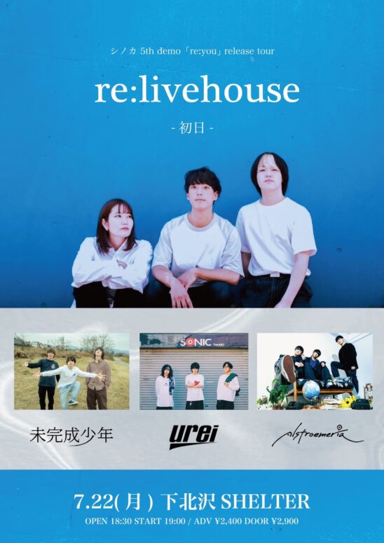 SCHEDULE 2024 07 22 Monday シノカ 5th demo「re:you」release tour “re:livehouse” OPEN 18:30 - START 19:00 Tweet シノカ 未完成少年 urei Alstroemeria TICKETADV¥2400 / DOOR¥2900 【発売日】 BAND予約 Share