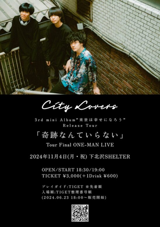 SCHEDULE 2024 11 04 Monday City Lovers 3rd mini Album “来世は幸せになろう”Release TOUR OPEN 18:30 - START 19:00 Tweet City Lovers TICKETADV¥3000 / DOOR¥3500 【発売日】 TIGET https://tiget.net/events/326325 Share