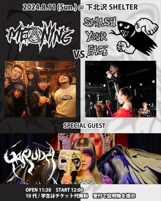SCHEDULE 2024 08 11 Sunday DAY EVENT MEANING x SMASH YOUR FACE OPEN 11:30 - START 12:00 Tweet MEANING SMASH YOUR FACE SPECIAL GUEST:GARUDA TICKETADV¥3000 / DOOR¥3500 ※10代/学生はチケット代無料、1Dのみ(受付で証明物を提示) 【発売日】 BAND予約 Share