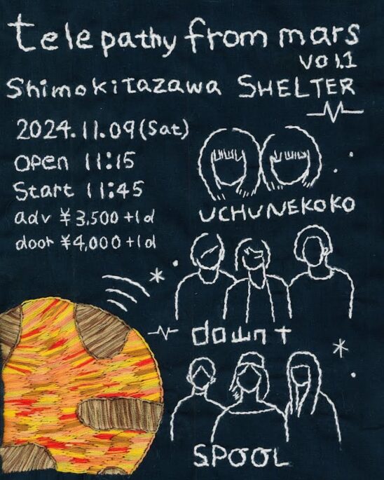 SCHEDULE 2024 11 09 Saturday DAY EVENT telepathy from mars vol.1 OPEN 11:15 - START 11:45 Tweet SPOOL downt 宇宙ネコ子 TICKETADV¥3500 / DOOR¥4000 【発売日】 THANK YOU!! SOLD OUT!! Share