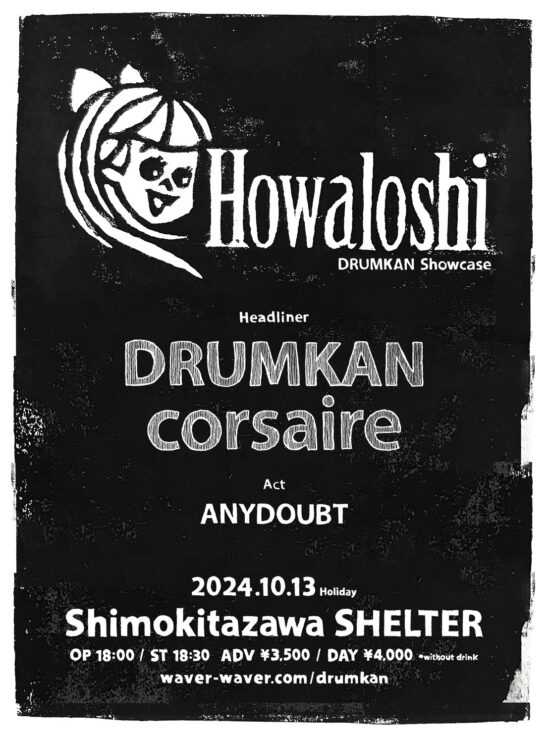 SCHEDULE 2024 10 13 Sunday Drumkan show case 『Howaloshi』 OPEN 18:00 - START 18:30 Tweet Drumkan Corsaire Anydoubt TICKETADV¥3500 / DOOR¥4000 【発売日】 8/1〜e+ Share