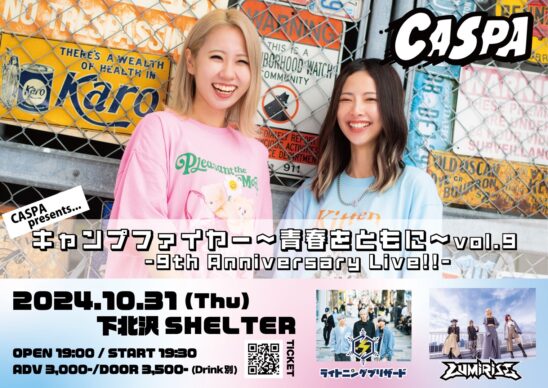 SCHEDULE 2024 10 31 Thursday キャンプファイヤー〜青春をともに〜vol.9 -9th Anniversary Live!!- OPEN 19:00 - START 19:30 Tweet CASPA LUMiRiSE ライトニングブリザード TICKETADV¥3000 / DOOR¥3500 【発売日】 7/24〜Livepocket https://t.livepocket.jp/e/90v1f Share
