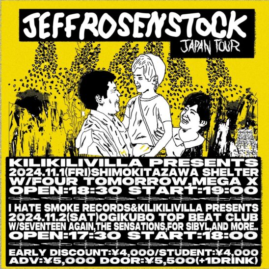 SCHEDULE 2024 11 01 Friday KiliKiliVilla presents Jeff Rosenstock Japan Tour OPEN 18:30 - START 19:00 Tweet FOUR TOMORROW MEGA X Jeff Rosenstock Band TICKETADV¥5000 / DOOR¥5500 早割&学生割引¥4000 / Tシャツ付き¥6500 【発売日】 8/30〜e+ Share