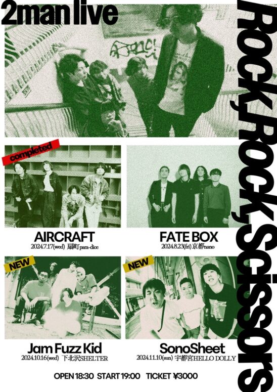 SCHEDULE 2024 10 16 Wednesday Transit My Youth pre.「Rock,Rock,Scissors」 OPEN 18:30 - START 19:00 Tweet Transit My Youth Jam Fuzz Kid TICKETADV¥3000 【発売日】 BAND予約 Share