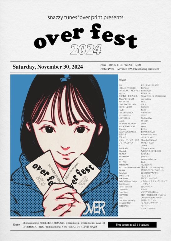 SCHEDULE 2024 11 30 Saturday SNAZZY TUNES × over print presents 『over fest 2024』 OPEN 11:30 - START 12:00 Tweet 下北沢SHELTER / MOSAiC /近松/近道/ WAVER / LIVE HOLIC / ReG /ろくでもない夜/ ERA /UP ※10会場往来自由 TICKETADV¥4900 【発売日】 8/6〜e+ Share
