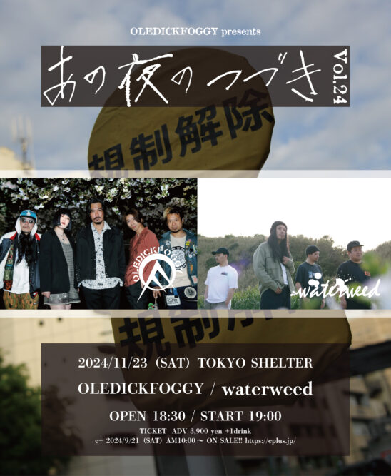 SCHEDULE 2024 11 23 Saturday OLEDICKFOGGY presents「あの夜のつづき Vol.24」 OPEN 18:30 - START 19:00 Tweet OLEDICKFOGGY waterweed TICKETADV¥3900 / DOOR¥4400 【発売日】 9/21〜e+・各BAND予約 Share