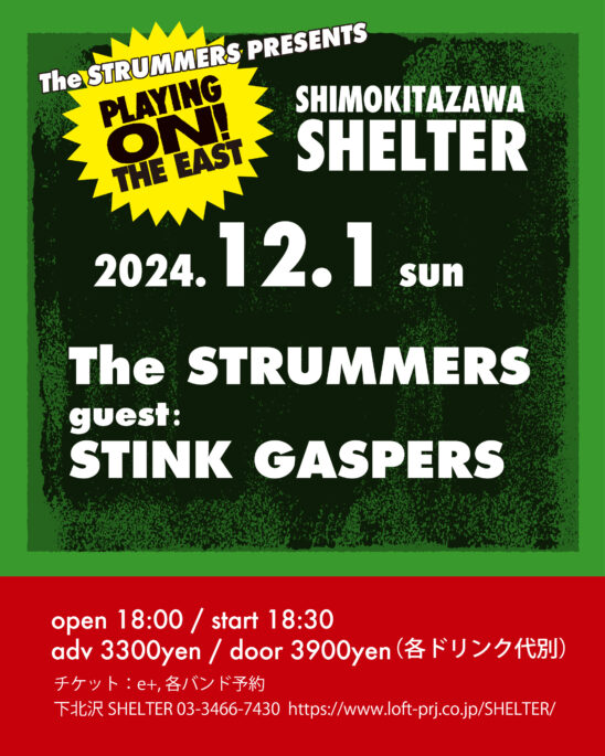 SCHEDULE 2024 12 01 Sunday PLAYING ON THE EAST OPEN 18:00 - START 18:30 Tweet The STRUMMERS GUEST:STINK GASPERS TICKETADV¥3300 / DOOR¥3900 【発売日】 9/14〜e+ Share