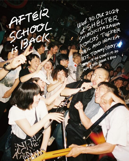 SCHEDULE 2024 10 30 Wednesday Shimokitazawa SHELTER 33rd Anniversary KONCOS & SHELTER PRESENTS AFTER SCHOOL OPEN 19:00 - START 19:30 Tweet NEIL AND IRAIZA TUCKER KONCOS DJ:TOMMY (BOY) TICKETADV¥3300 / DOOR¥3800 【発売日】 9/11〜e+ https://eplus.jp/sf/detail/4184200001-P0030001・BAND・SHELTER予約 【入場順】 e+→予約 Share このイベントの予約は締めきりました。