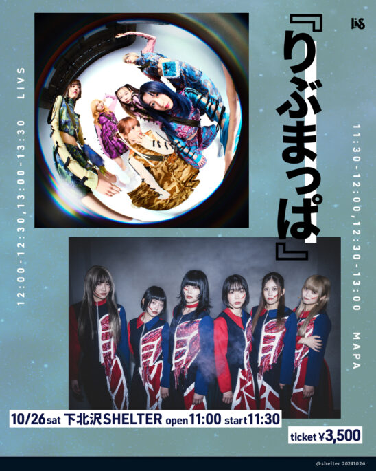 SCHEDULE 2024 10 26 Saturday DAY EVENT 『りぶまっぱ』 OPEN 11:00 - START 11:30 Tweet LiVS MAPA TICKETADV¥3500 【発売日】 9/7〜Livepocket https://t.livepocket.jp/e/livmapa02 Share