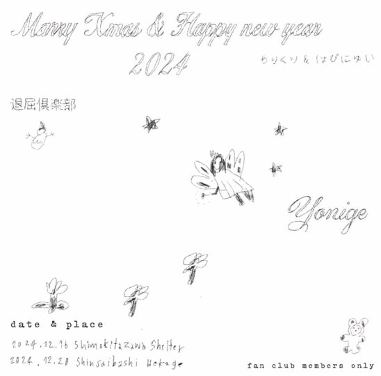 SCHEDULE 2024 12 16 Monday yonigeファンクラブ限定ライブ 「めりくり&はぴにゅい 2024」 OPEN 19:00 - START 19:45 Tweet yonige TICKETADV¥4500 / 限定Tシャツ付¥7000 ※ファンクラブ限定 Share