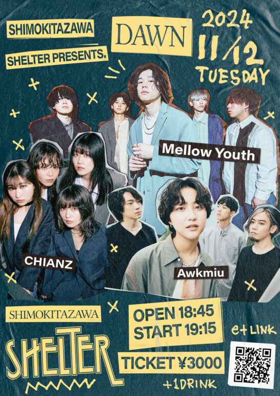 SCHEDULE 2024 11 12 Tuesday Shimokitazawa SHELTER pre. Dawn OPEN 18:45 - START 19:15 Tweet Awkmiu CHIANZ Mellow Youth TICKETADV¥3000 / DOOR¥3500 【発売日】 e+:2024年9月20日20:00〜発売 https://eplus.jp/sf/detail/4181980001-P0030001 Share このイベントの予約は締めきりました。