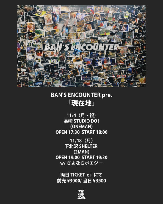 SCHEDULE 2024 11 18 Monday BAN’S ENCOUNTER pre. 「現在地」 OPEN 19:00 - START 19:30 Tweet BAN’S ENCOUNTER さよならポエジー TICKETTHANK YOU! SOLD OUT!! ADV¥3000 / DOOR¥3500 【発売日】 9/28〜e+ Share