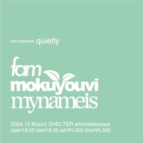 SCHEDULE 2024 12 08 Sunday fam presents “quietly” OPEN 18:00 - START 18:30 Tweet fam mokuyouvi mynameis TICKETADV¥3000 / DOOR¥3500 【発売日】 10/15 12時〜e+ Share