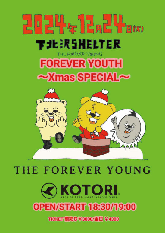 SCHEDULE 2024 12 24 Tuesday THE FOREVER YOUNG presents “FOREVER YOUTH〜Xmas SPECIAL OPEN 18:30 - START 19:00 Tweet THE FOREVER YOUNG KOTORI TICKETADV¥3800 / DOOR¥4300 【発売日】 THANK YOU!! SOLD OUT!! ※6歳以上はチケット必要 Share