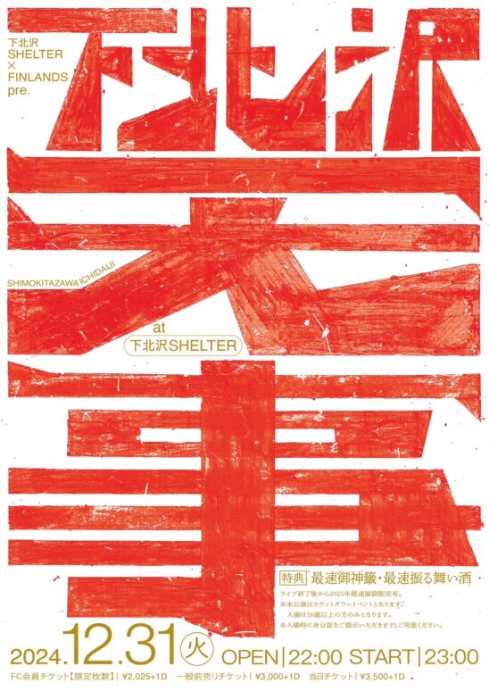 SCHEDULE 2024 12 31 Tuesday 下北沢SHELTER×FINLANDS pre.「下北沢一大事」 OPEN 22:00 - START 23:00 Tweet FINLANDS TICKETTAHNK YOU! SOLD OUT!! ADV¥3000 / DOOR¥3500 / FC会員¥2025 【発売日】 11/1〜e+ https://eplus.jp/sf/detail/4204550001-P0030001 ※FC先行あり ※本公演はカウントダウンイベントになりますので、18歳未満の方はご入場いただけません。 ※入場時に身分証をご提示いただきます。ご用意ください。 Share
