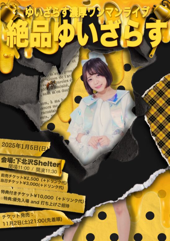 SCHEDULE 2025 01 05 Sunday DAY EVENT ゆいざらす濃厚ワンマンライブ 〜絶品ゆいざらす〜 OPEN 11:00 - START 11:30 Tweet ゆいざらす TICKETADV¥2500 / 特典付¥10000 【発売日】 TiGET https://tiget.net/events/355565 #ゆいざらす Share