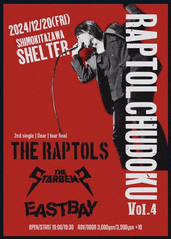 SCHEDULE 2024 12 20 Friday THE RAPTOLS pre. 「Dear Tour Finalラプトル中毒 Vol.4」 OPEN 19:00 - START 19:30 Tweet THE RAPTOLS THE STARBEMS EASTBAY TICKETADV¥3000 / DOOR¥3500 【発売日】 BAND予約 Share