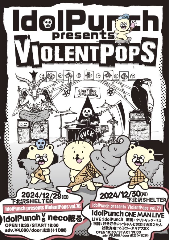 SCHEDULE 2024 12 30 Monday IdolPunch presents ViolentPops vol.77 『IdolPunch ONE MAN LIVE』 OPEN 18:30 - START 19:00 Tweet LIVE:IdolPunch 前説:クリトリック・リス 祝辞:好き好きロンちゃんとおまけのまこたん 社歌斉唱:でぶコーネリアスEX TICKETADV¥3500 / DOOR¥未定 【発売日】 11/9 18時〜 e+ https://eplus.jp/sf/detail/4219910001-P0030001 ラコスバー店頭 Share