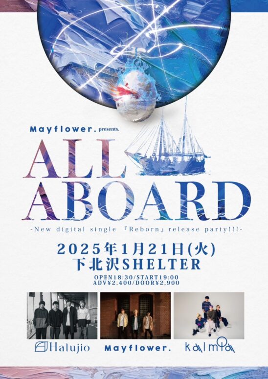 SCHEDULE 2025 01 21 Tuesday Mayflower. presents ” ALL ABOARD ” New digital single 『Reborn』release party!!! OPEN 18:30 - START 19:00 Tweet Mayflower. kalmia Halujio TICKETADV¥2400 / DOOR¥2900 【発売日】 各BAND予約 #Mayflower.#kalmia#Halujio Share