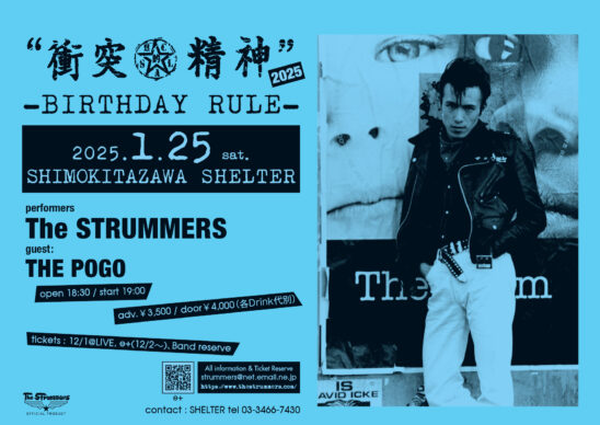 SCHEDULE 2025 01 25 Saturday 衝突的精神2025 “BIRTHDAY RULE” OPEN 18:30 - START 19:00 Tweet The STRUMMERS GUEST : THE POGO TICKETADV¥3500 / DOOR¥4000 【発売日】 12/1 BAND手売り 12/2 12時〜e+・各BAND予約 【入場順】 手売り→e+→BAND予約 #The STRUMMERS#[GUEST] THE POGO Share